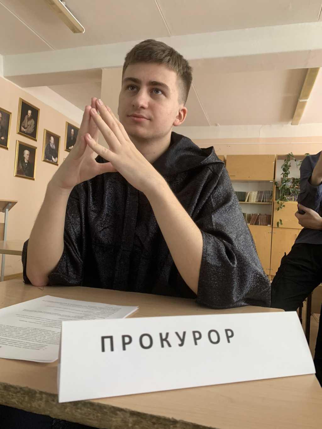 Целая серия таких уроков недавно прошла в 10 «М» классе. «Физики-математики» (М - значит «математический») в течение 12 программных часов литературы вели «расследование» по роману Ф.М.Достоевского. А на заключительном занятии они разыграли настоящий костюмированный спектакль: судья, прокурор, присяжные, защитник и многочисленные свидетели собрались в зале заседаний и после недолгих прений вынесли Родиону Раскольникову приговор - 8 лет тюрьмы. (Старшеклассникам, надеемся, не нужно напоминать, чем «прославился» герой, а ученикам младших и средних классов скажем кратко - он убил старушку и считал, что поступил совершенно справедливо.)