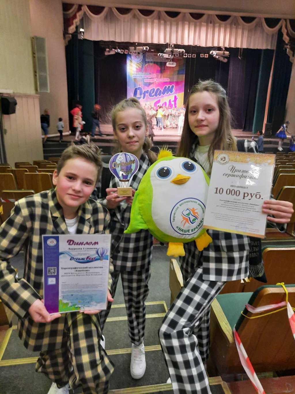 Диплом лауреата I степени Международного конкурса-фестиваля искусств Dream Fest также из Казани привез хореографический коллектив «Emotions», четверо участников которого - наши лицеисты: Илона Ветрова (4 «А»), Стеблюк Дарья, Вадим Малышкин и Вероника Егорова (6 «А»).