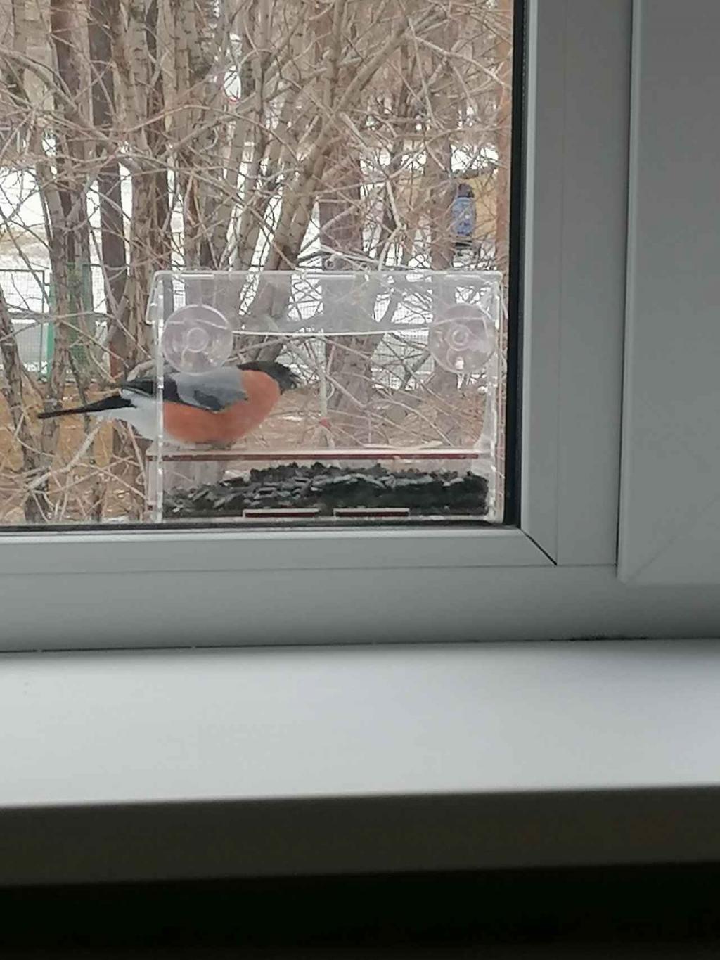 А еще малыши ежедневно кормят птичек, насыпая вкусное лакомство в кормушку. На днях к ребятам прилетел снегирь!
