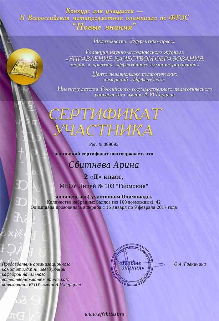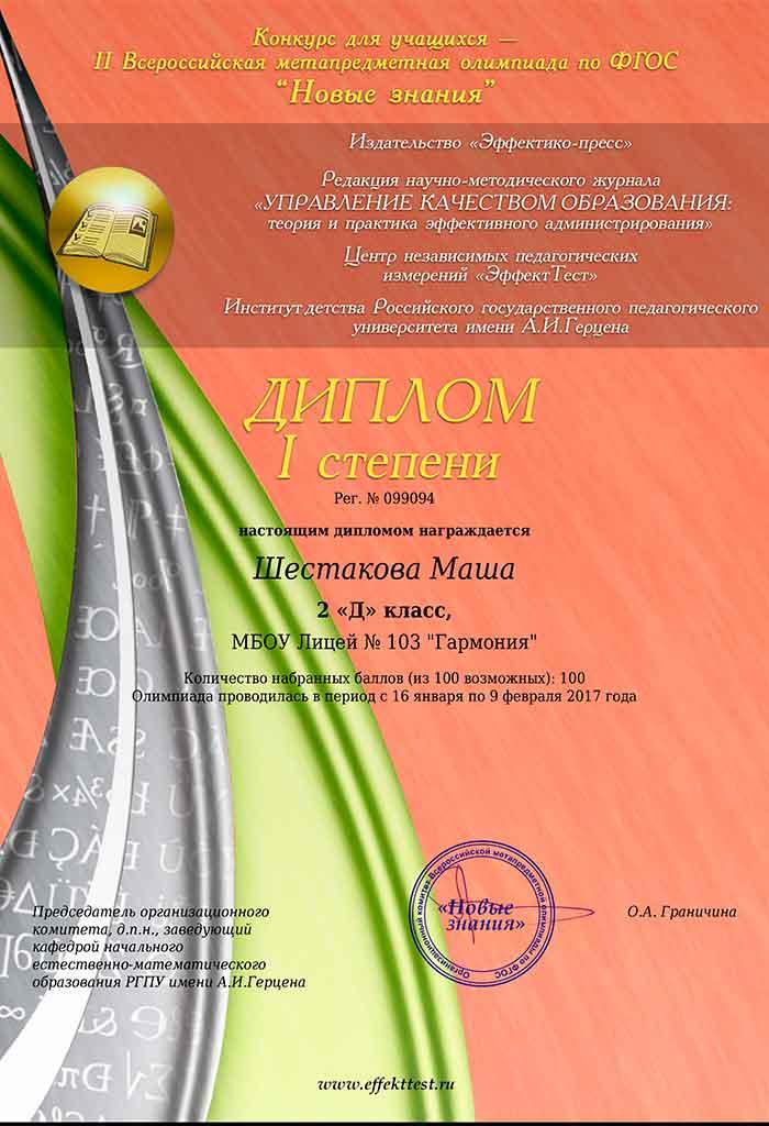 По итогам II Всероссийской метапредметной олимпиады по ФГОС «Новые знания» ученицы 2 «Д» класса получили дипломы: