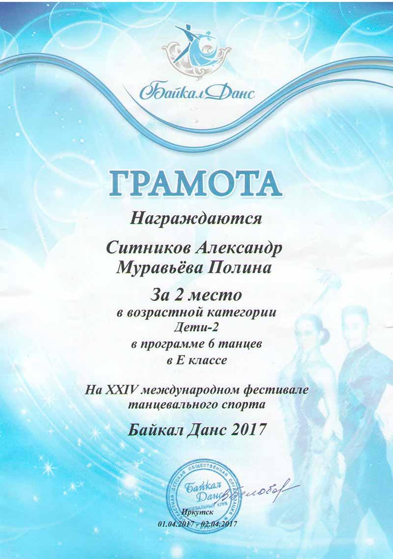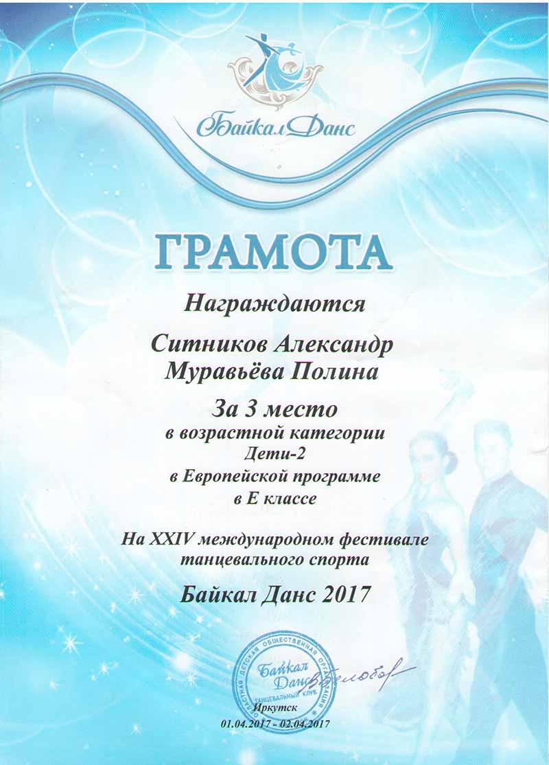В Иркутске закончился XXIV международный фестиваль танцевального спорта «Байкал данс - 2017», где выступили Ситников Александр (учащийся 3 «А» класса) со своей партнершей Муравьёвой Полиной. Танцоры заняли 2 место в возрастной категории Дети - 2 в программе 6 танцев в «Е» классе и 3 место в Европейской программе в «Е» классе в той же возрастной категории.