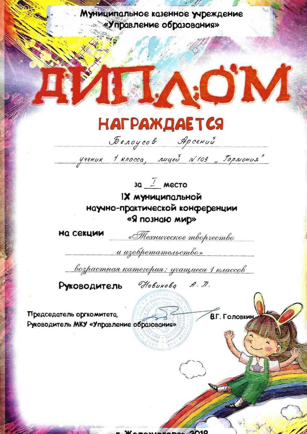 • В МБУ ДО «СЮТ» в секции «Техническое творчество и изобретательство»  выступил Белоусов Арсений  с исследовательской работой «Универсальное сигнальное устройство ребёнка» (руководитель: Новикова А.П.). Данная работа  была отмечена дипломом I  степени.