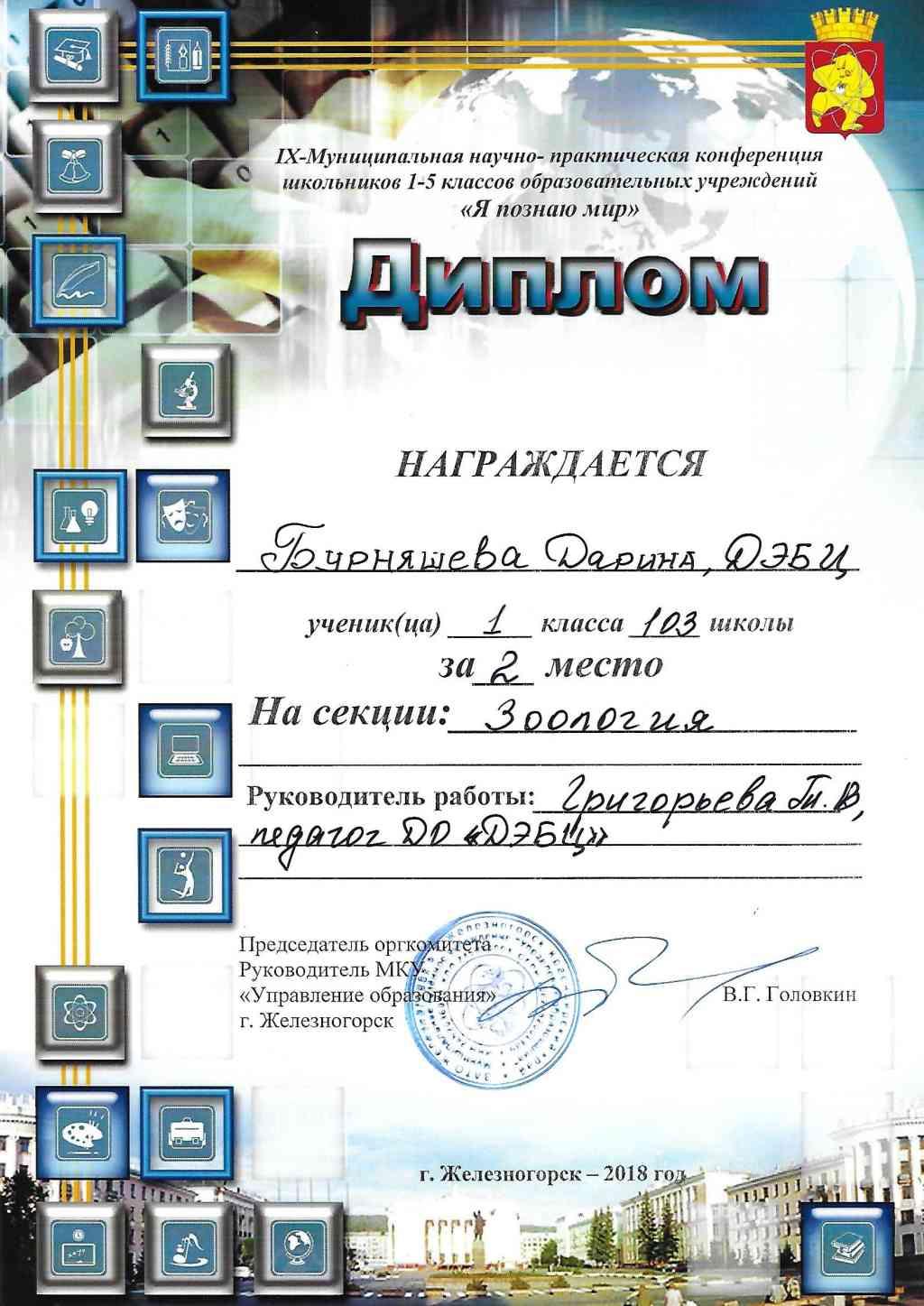 • В МБУДО «Дворец творчества  детей и молодёжи»  Присяжный Евгений  в секции «Мировая художественная культура» представил исследовательскую работу «Имя в жизни человека» (руководитель: Титова Л.В.). Данная работа  была отмечена дипломом I степени.