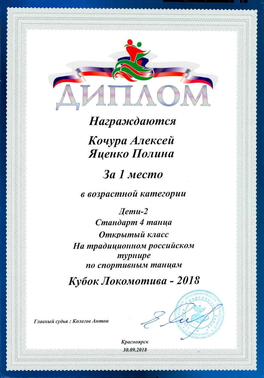 Занял 1 место в ХХII Российском турнире по танцевальному спорту «Кубок Красноярья-2018» в номинациях – Дети 10-11 лет в программах – Латиноамериканские и Европейские танцы.