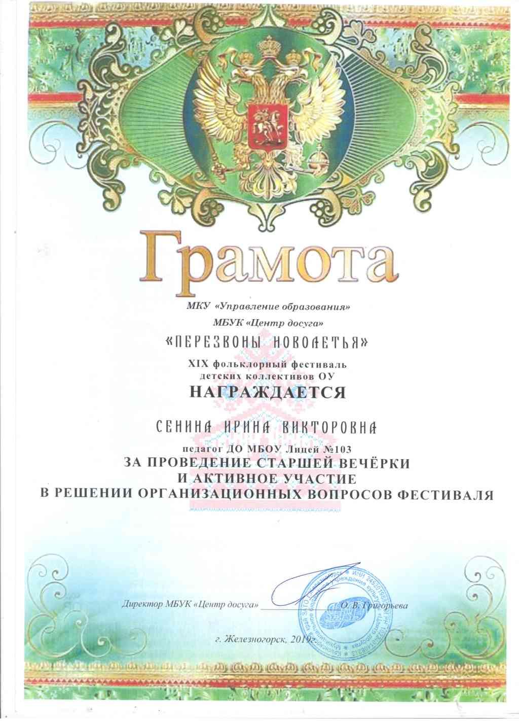 5-6 марта вМБУК «Центр Досуга» состоялся XVIX городской фольклорный фестиваль «Перезвоны Новолетья». Фольклорный ансамбль «Красная горка» представил зрителям фестиваля разнообразную концертную программу, включающую в себя различные вокальные и хореографические жанры (скоморошина, былина, кадриль, протяжная лирическая, свадебная) и был награжден дипломом 1 степени в номинации «Мастера» (старшая группа) и дипломом 1 степени в номинации «Песенно – обрядовый фольклор» (младшая группа). Учителя, педагоги и учащиеся лицея оформили замечательную выставку «Мастеровой двор», за которую были отмечены грамотами за сохранение традиций русского прикладного творчества (Ломакина Г. Н., Ошкина Л.В., Сенина И.В., Чихватова О.К., Титова Л.В., Чумичев А.Ю.). Ярко и эмоционально выступили в конкурсе «Русская коса – девичья краса» Баева Анастасия и Смирнова Софья. За творческие успехи и верность русскому фольклору многие участники фольклорного ансамбля были удостоены персональных грамот (Шабанова Диана(9а), Дутова Полина (8а), Вайзбек Максим, Пушков Алексей (7м), Смирнова Софья (7а), Баева Анастасия(5а), Макарова Юлия, Протопопова Вероника, Франтикова Валерия (5д).