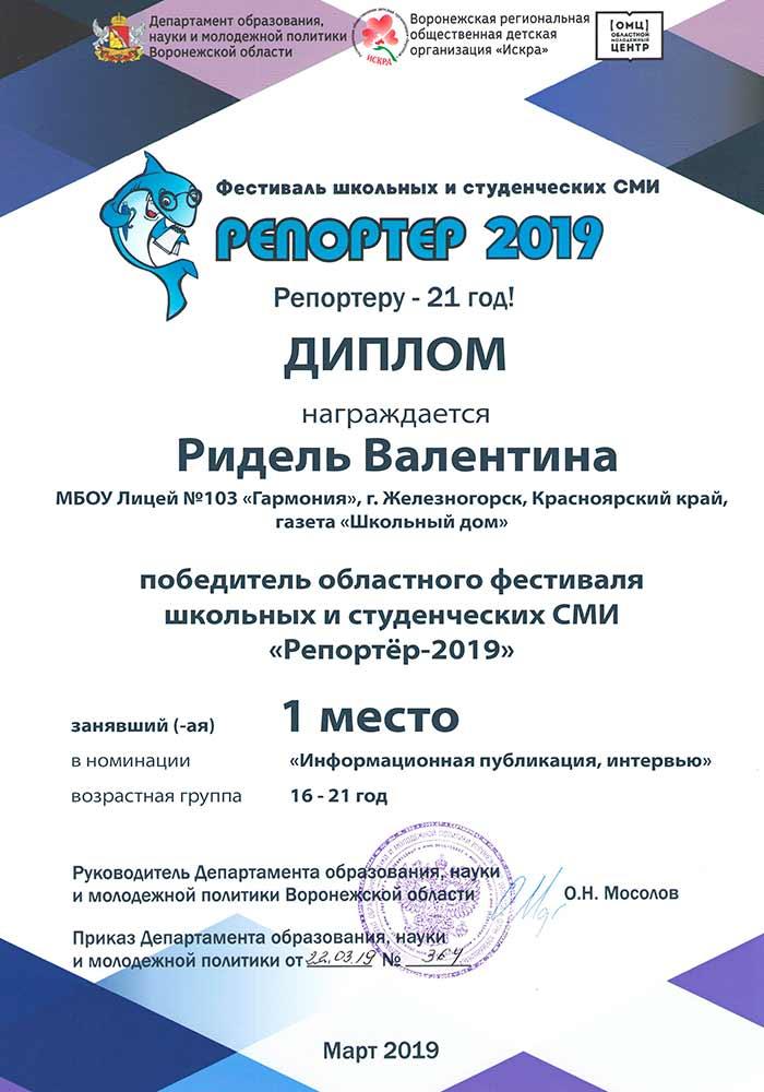 Прежде всего это «Репортёр», который проводится в славном городе Воронеж. Газетчики Лицея №103 участвуют в нём практически ежегодно начиная с 2011 года. Ученица 11 «П» Валентина Ридель за интервью с выпускниками Алёной Паниной и Василием Башмаковым получила диплом за 1 место, газета «Школьный дом» победила в номинации «Печатная газета, журнал», а наши коллеги из газеты «Алмаз» были награждены сертификатом за участие VI открытый конкурс «Мир глазами молодых» родом из города Ревда Свердловской области. Заявка туда была отправлена буквально в последний день, практически за несколько часов до окончания приема. Организаторы нам были рады. В номинации «Лучшее школьное СМИ» у газеты «Алмаз» - 1 место, у «Школьного дома» - 2 место. Были награждены авторские работы Алисы Шаститко (1 место в номинации «Лучшее интервью»), Валентины Дудиной (3 место в номинации «Лучший социальный эксперимент»), Валентины Ридель (3 место в номинации «Лучшее интервью»). Руководители получили дипломы «За лучшую работу с юнкорами».