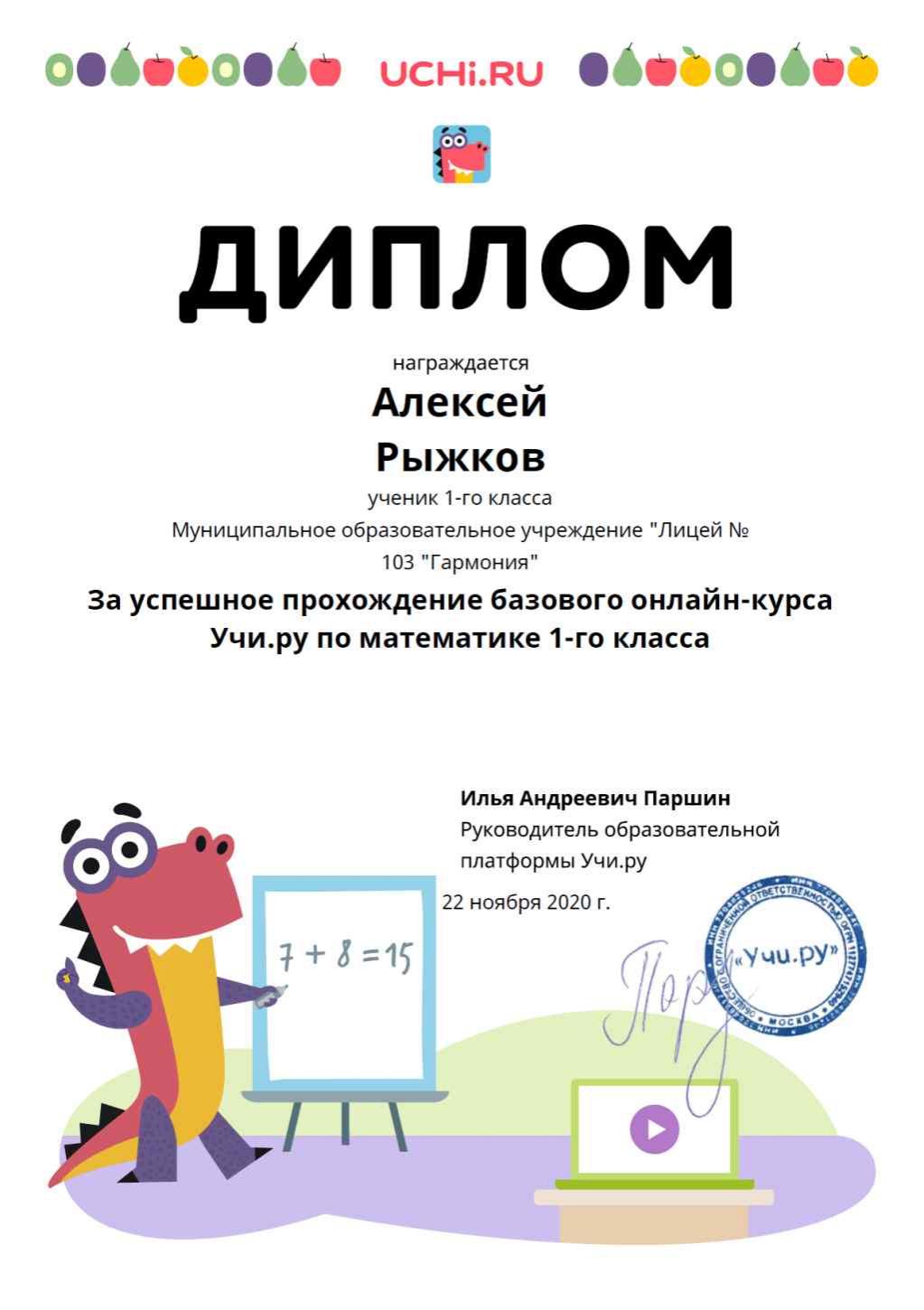по математике и русскому языку на сайте Учи.ру, награждён грамотой за лучший результат в школе по итогам онлайн-марафона и признан лучшим учеником месяца в лицее по рейтингу Учи.ру! Поздравляем!