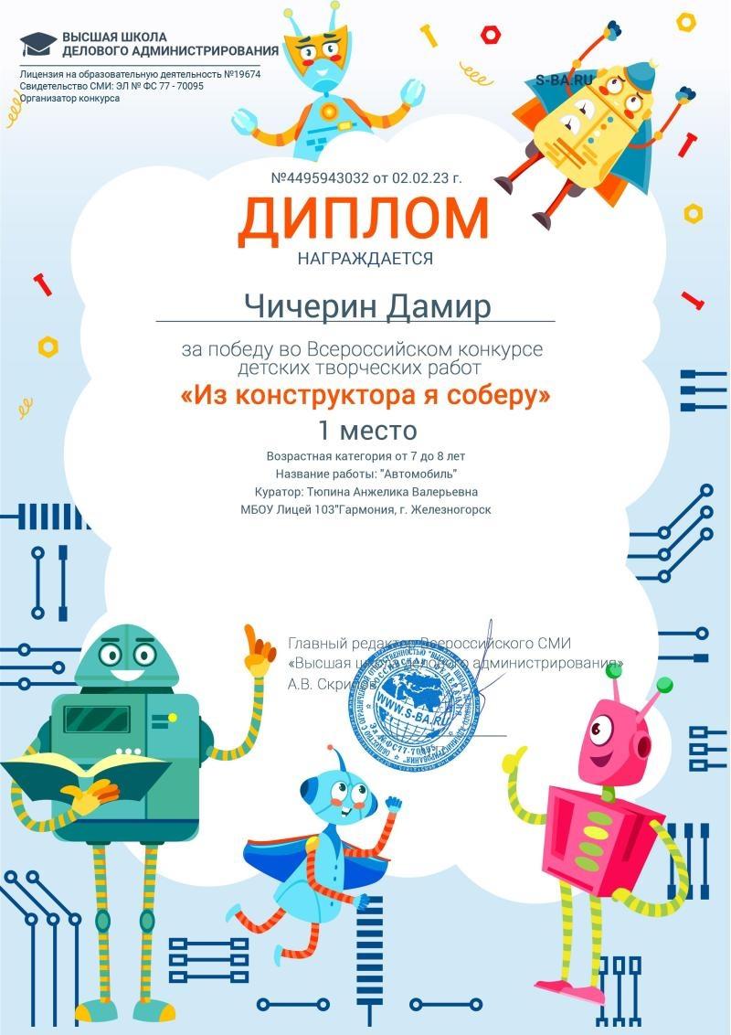 1. Наши ученики под руководством Анжелики Валерьевны Тюпиной приняли участие во всероссийском конкурсе творческих работ "Из конструктора я соберу". Поздравляем Дамира Чичерина с I местом и Марию Пшеничникову со II местом!