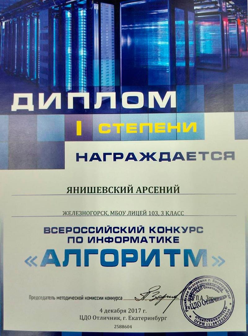 Дипломами I степени награждены за успешное участие во Всероссийском конкурсе по информатике «Алгоритм»: