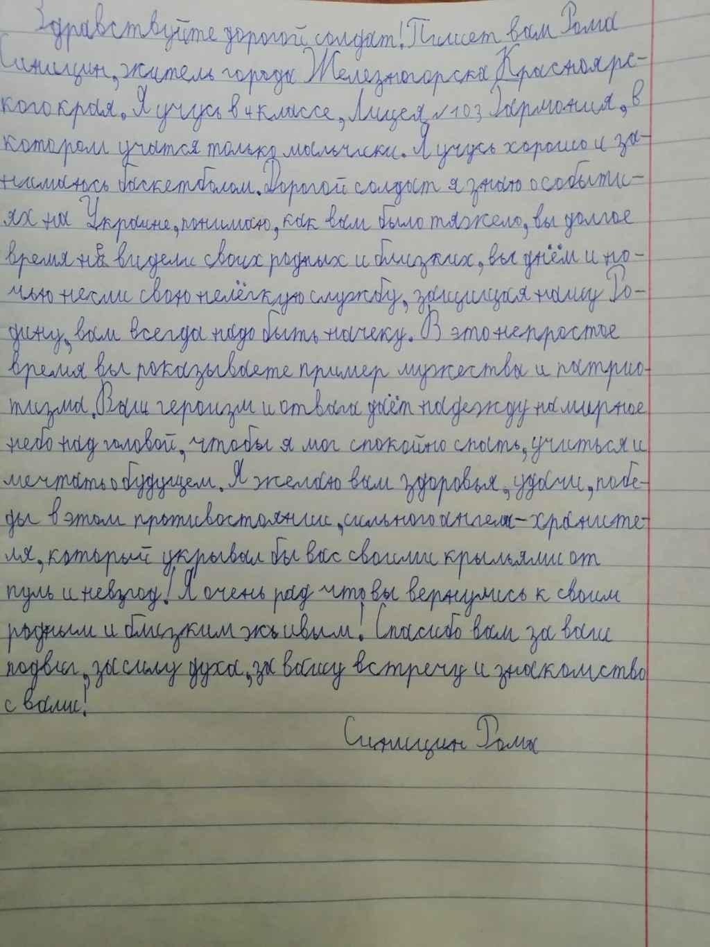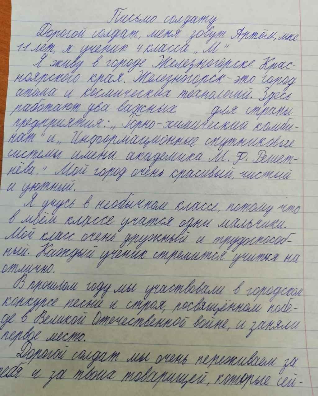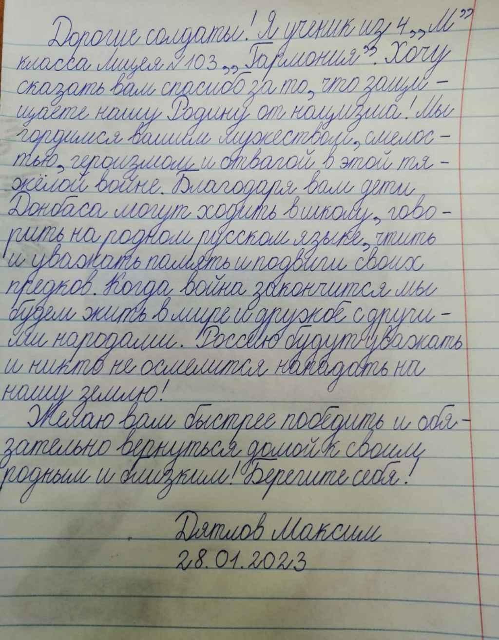 Также учащиеся 4 «М» класса Артем Аксёнов, Максим Дятлов, Никита Гайголос и Роман Синицин написали «Письмо солдату» и передали их для участников военных действий.