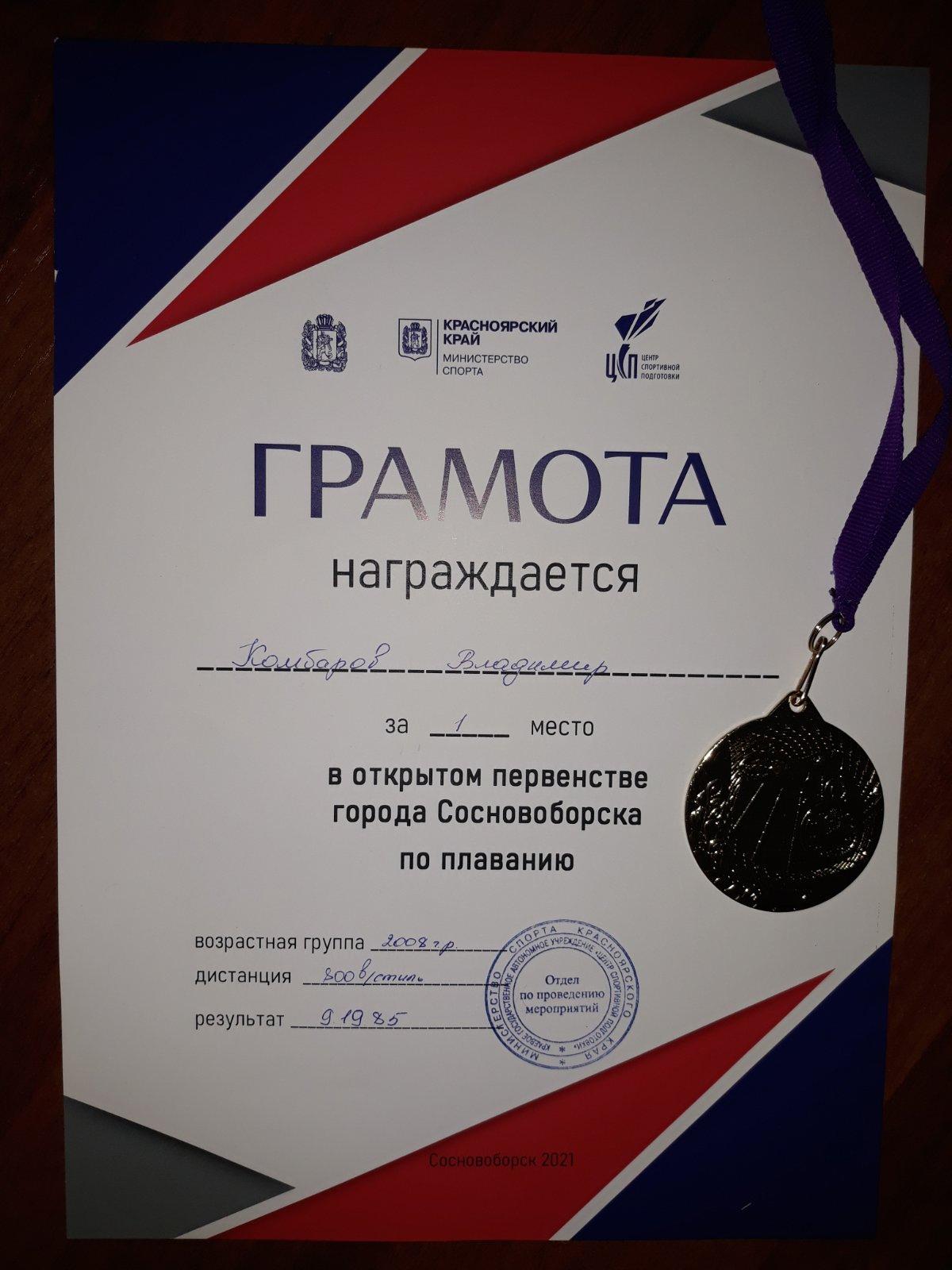 • Владимир Комбаров (6 "Л" класс, Чурина Е.О.) ездил на соревнования по плаванию в город Сосновоборск и занял I место! Также Владимир участвовал в Первенстве Красноярского края по плаванию в Канске и занял I и III место на дистанции 200 метров, I место 50м баттерфляй;