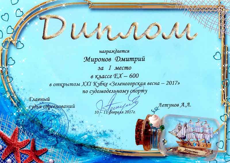 Младший брат Миронов Денис - ученик 2 «М» класса в открытом XXI Кубке «Зеленогорская весна - 2017» по судомодельному спорту занял I место в классе EX-600.