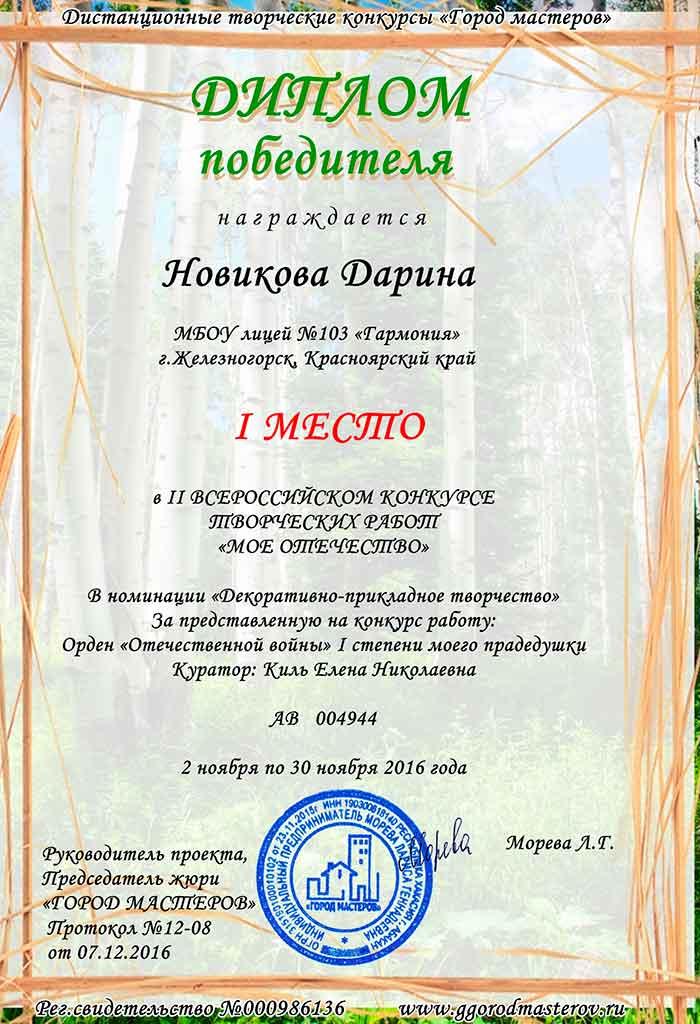 Ученица 2 «Д» класса Новикова Дарина, стала победителем Всероссийского конкурса творческих работ «Мое Отечество».
