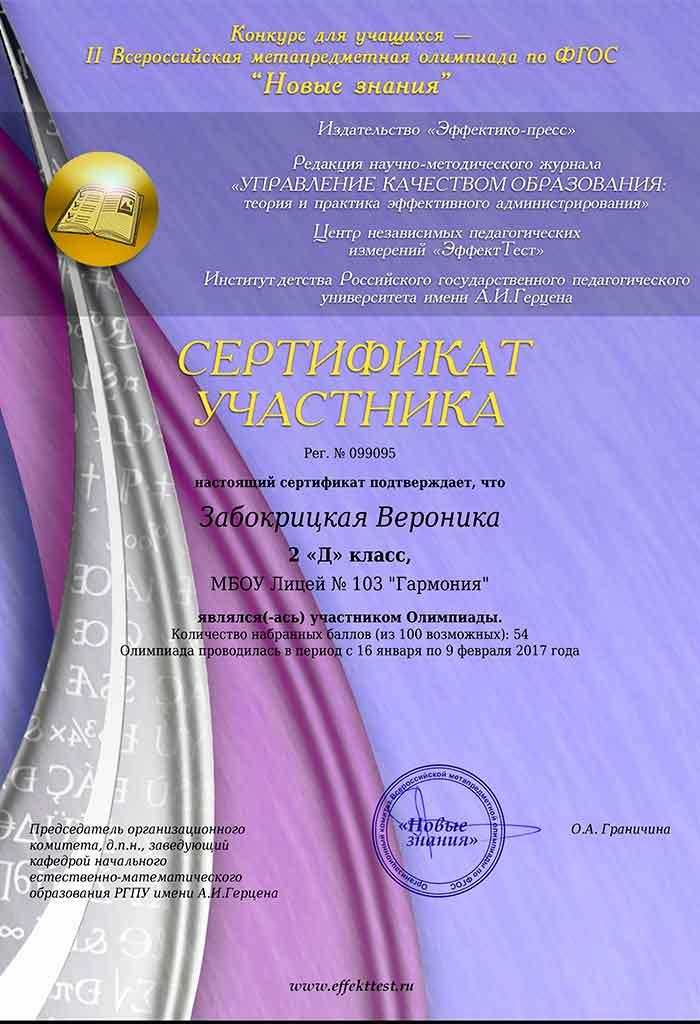 По итогам II Всероссийской метапредметной олимпиады по ФГОС «Новые знания» ученицы 2 «Д» класса получили дипломы: