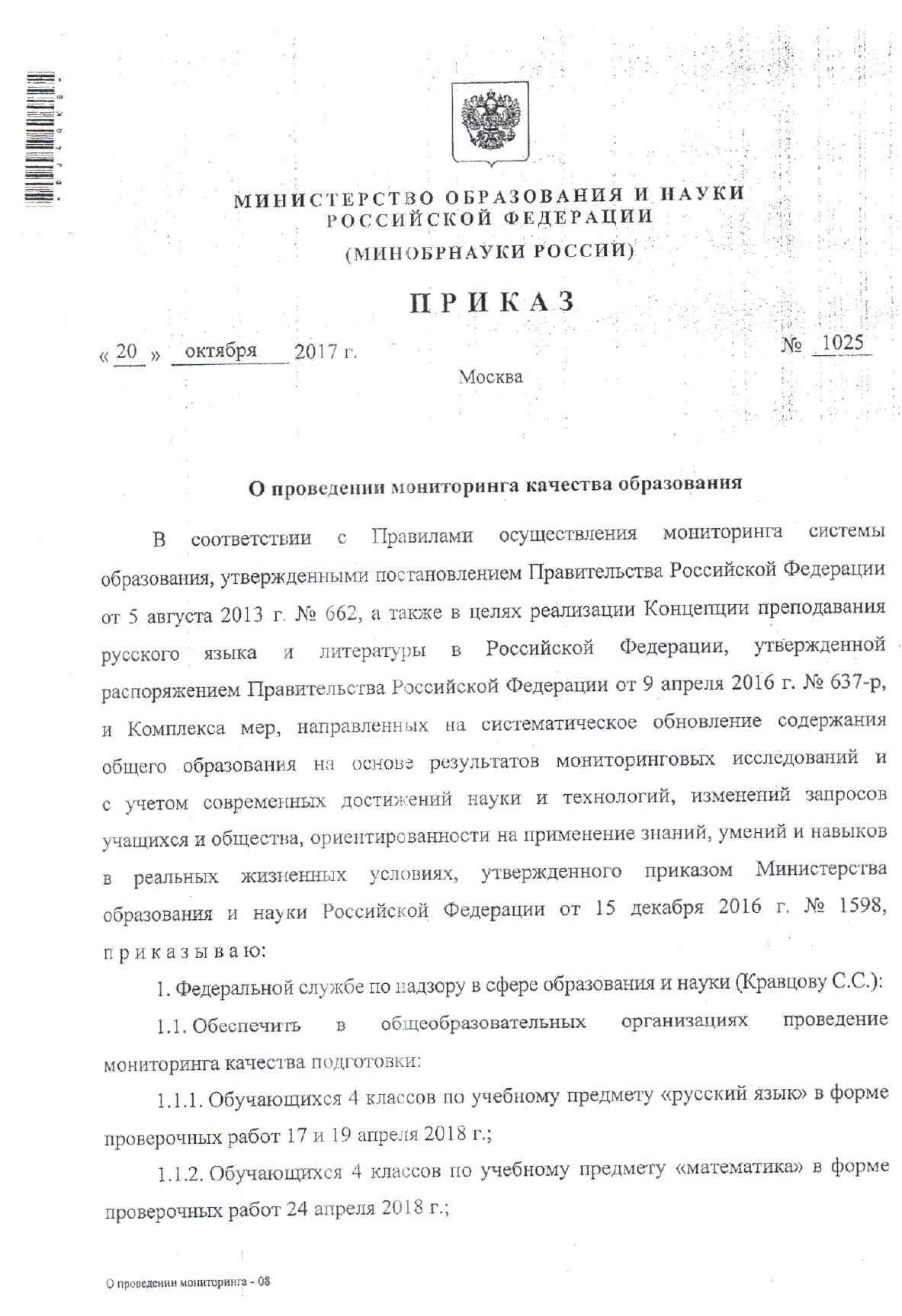 Приказ Минобрнауки №1025 от 20.10.2017