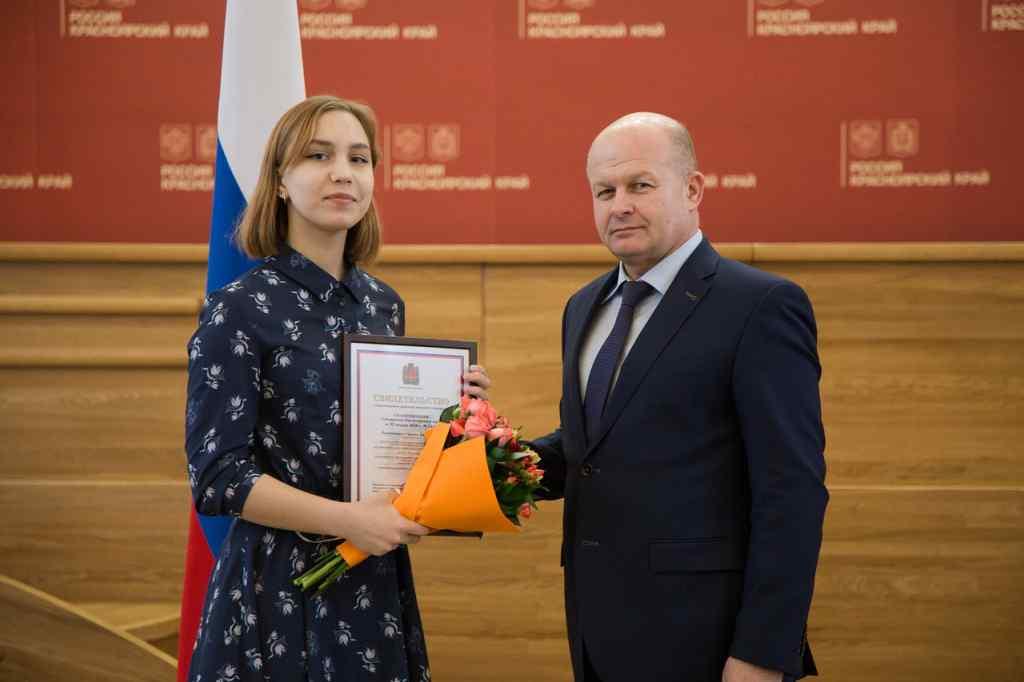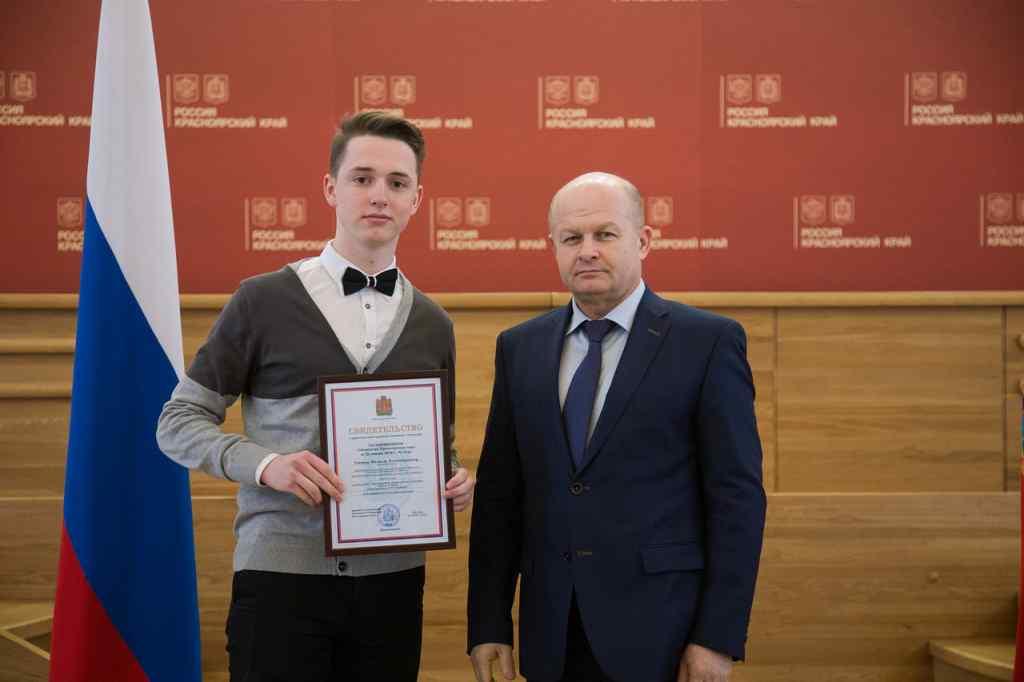 27 февраля заместитель председателя правительства Красноярского края Алексей Подкорытов вручил учащимся образовательных организаций Красноярского края свидетельства о присуждении краевых именных стипендий по итогам 2017 года. Свидетельства из его рук получили 35 одаренных школьников.