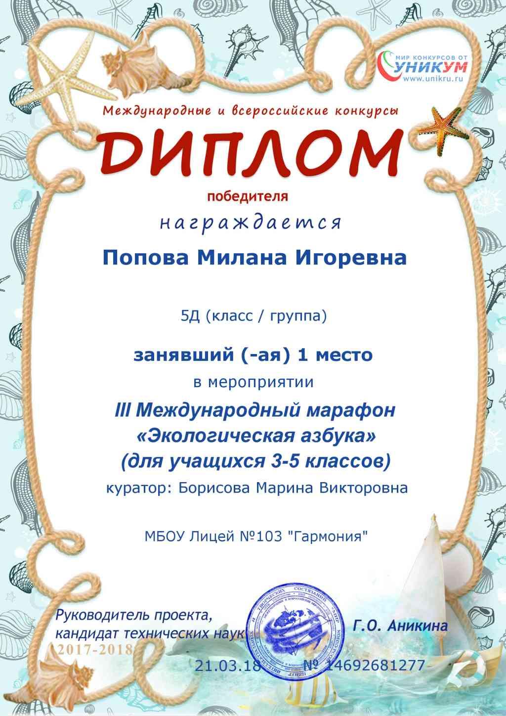 09.04.2018Поздравляем Борисову Марину Викторовну и её воспитанницу Попову Милану (учащуюся 5Д) с победой в двух международных конкурсах.