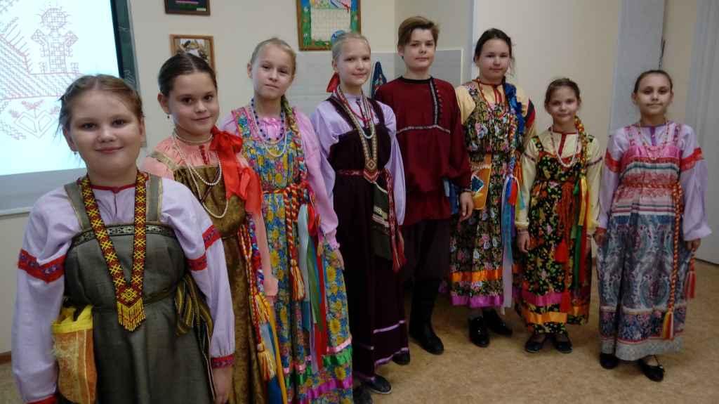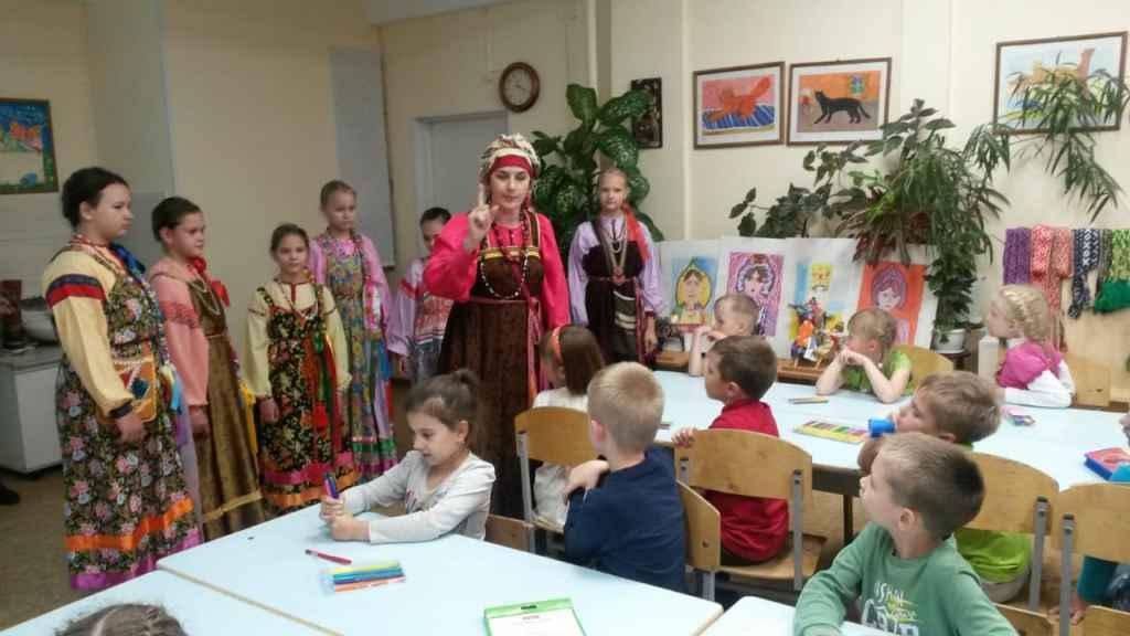 Мероприятие было посвящено истории и традициям русского костюма. Школьники и их родители познакомились с многообразием русского женского костюма и с особенностями мужского костюма, научились отличать праздничный костюм от повседневного. Своими руками могли потрогать праздничные женские сарафаны и мужские рубахи из фонда фольклорного ансамбля «Красная горка».  Дети познакомились с солярными – солнечными  знаками, украшающими русский костюм и оберегающими человека; увидели настоящие сапоги и лапти, а также, разнообразные кушаки, сплетённые мастерами. Девочкам очень понравились женские украшения – гайтаны и ожерелки. А мальчикам особое удовольствие доставила кукла - боец, сделанная участниками ансамбля. В завершении мероприятия, мастерски проведённого педагогами дополнительного образования Чихватовой О. К. и Сениной И. В., дети получили рисунки для раскрашивания и остались очень довольны!