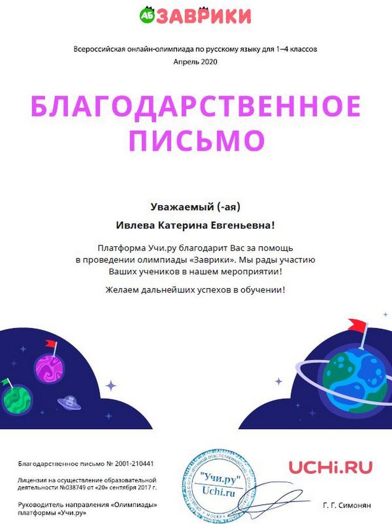 Восемь учеников 1 Л класса стали призерами Всероссийской онлайн-олимпиады 1-4 классов по русскому языку «Заврики».