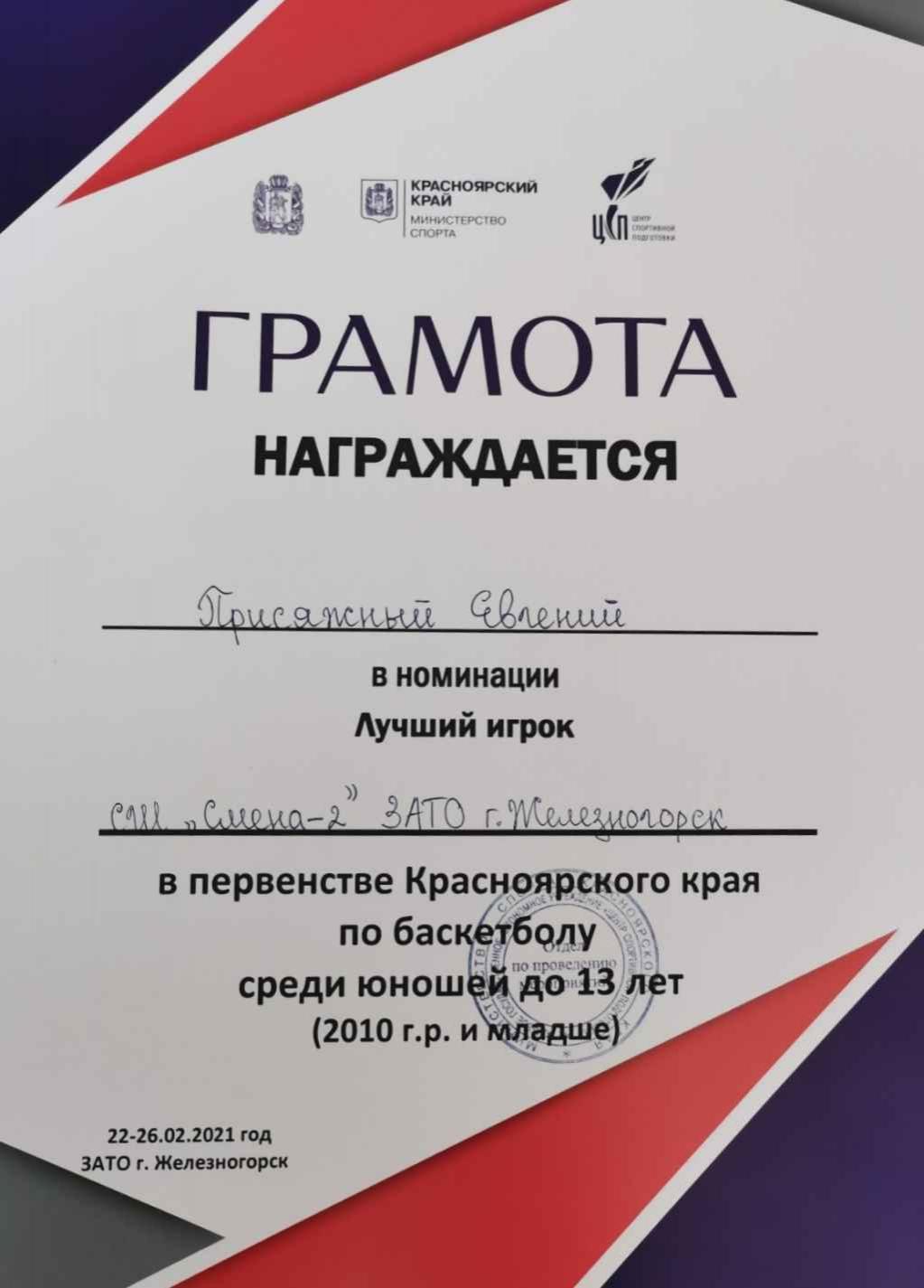 Евгений Присяжный признан лучшим игроком СШ «Смена-2» ЗАТО Железногорск по результатам первенства Красноярского края по баскетболу среди юношей до 13 лет, которое проходило с 22 по 26 февраля в Железногорске.